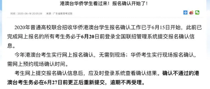 广东省教育考试院网站在6月12日发布消息,2020年普通高校联合招收华侨港澳台学生报名确认工作会从今年6月15日开始。详情请见下图: