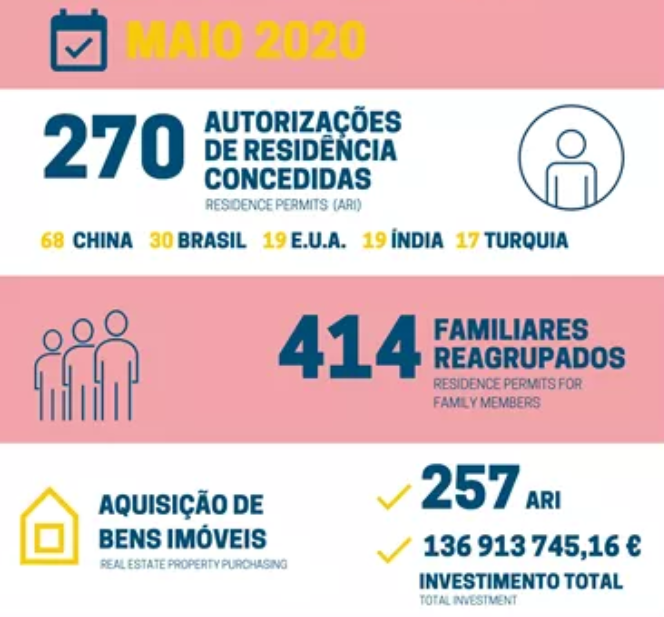 5月份,有270名主要申请人和414名附属申请人获得投资葡萄牙居住计划的许可,批准的申请人数量超过了4个月的总和!截至目前,2020年全国共发放居民卡1458张。