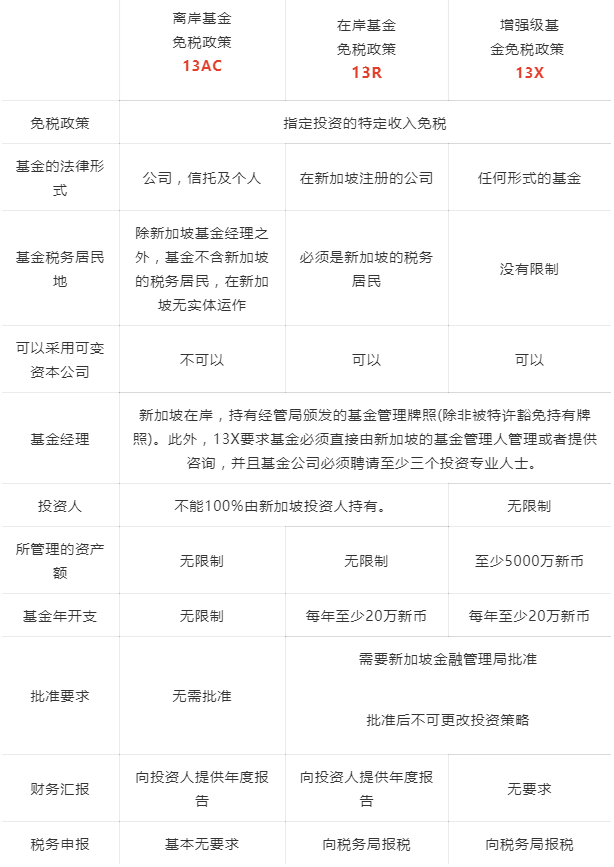 在新加坡的基金税务计划下,由新加坡在岸基金经理管理的基金,从指定投资中赚取的特定收入免税。如果基金持续满足免税的条款,那么在2024年12月31日之前获准的基金,将终身享受免税待遇。免税政策如下: