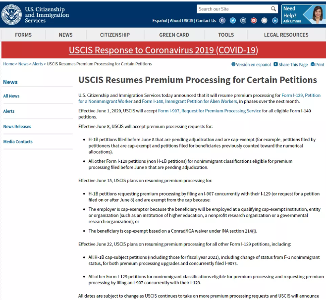 ▪ 从6月8日起,入境事务处将开始处理i-129申请及紧急处理,分为两个部分:6月8日前递交的H-1B申请,正在等待审理的申请;6月8日前递交的H-1B以外的申请;