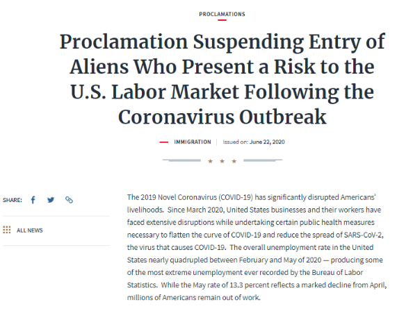 本周一,特朗普总统签署了进一步限制移民的行政命令,对现有的4月22日限制移民政令增加了更多限制,包括暂停海外美领馆针对四类工作签证的签发:特殊专业人员的H-1B签证、H-2B非农业外国工人临时工作签证、J培训生签证和L跨国企业高管签证的签发,以及这些签证持有人的入境。同时限制的还包括这些签证持有人的配偶签证的签发和入境。此外,4月22日发布的新移民登陆限制也一并延期到今年年底。该签证暂停政令在6月22日晚上发布,于美东时间6月24日凌晨12:01生效。