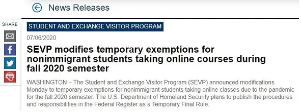 7月6日,SEVP提出的修改是专门针对留学生在2020年秋季学期的学习。具体内容包括: