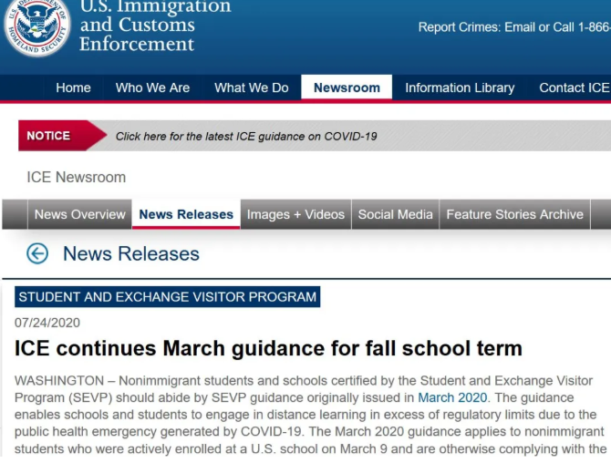 7月24日星期五,美国移民和海关执法局ice宣布,3月9日之后入学并持有有效美国签证的国际学生必须至少有一门线下课程,否则将无法进入美国。Ice要求所有学校不要向在线课程的所有新生发放I-20表格。