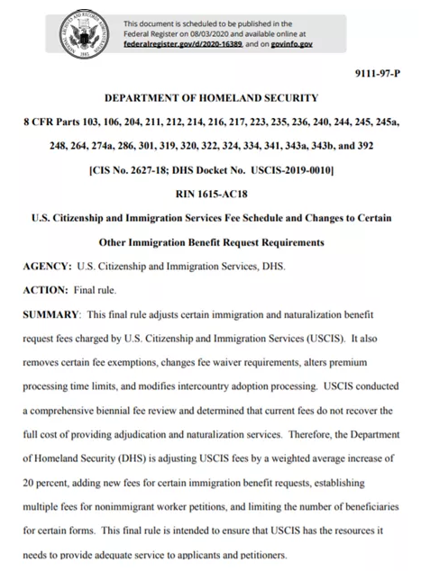2020年7月31日,美国国土安全部(DHS)宣布了一项最终规则,将某些移民和入籍申请的费用调涨约20%,以确保其下属机构——美国移民局(USCIS)收回其服务的成本。