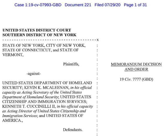 但是随着3月份,新冠疫情在美国迅速蔓延,为了防止移民或非移民申请人隐瞒病情,积极接受检测治疗和免疫,移民局于3月13日发布公告, 将接受新冠检测、治疗及免疫接种的申请人豁免在外。但各州仍有很多人对该项新规表示不满,并且持续上诉,认为该新规对弱势群体显示“敌意”。最终,7月29日,纽约州的联邦法院,支持了上诉请求,叫停公共负担新政在疫情期间的实施,并且禁止令在全美范围有效。
